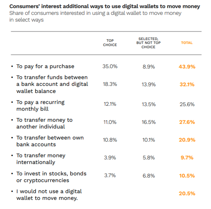 Digital wallets are gaining traction for their features beyond making purchases, but for now, transactions remain the most common use of the technology. The study found that 41% of consumers said they would likely use digital wallets to carry out financial transactions in the next year, just ahead of the 40% that said the same of storing and accessing payment methods.